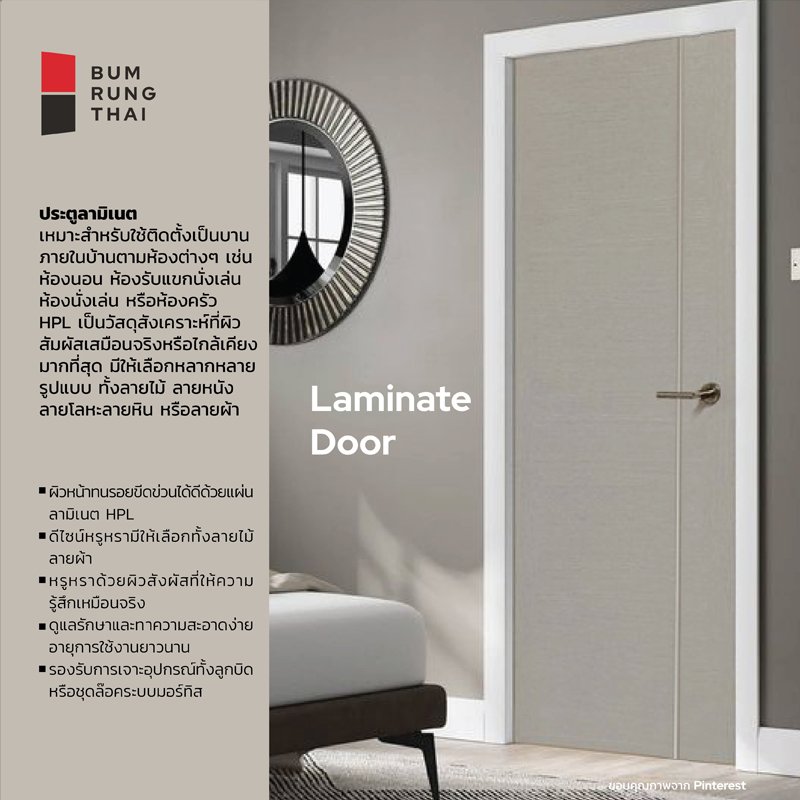 ประตูลามิเนตเหมาะสำหรับใช้ติดตั้งเป็นบานภายในบ้านตามห้องต่างๆ เช่น ห้องนอน ห้องรับแขกนั่งเล่น ห้องนั่งเล่น หรือห้องครัว