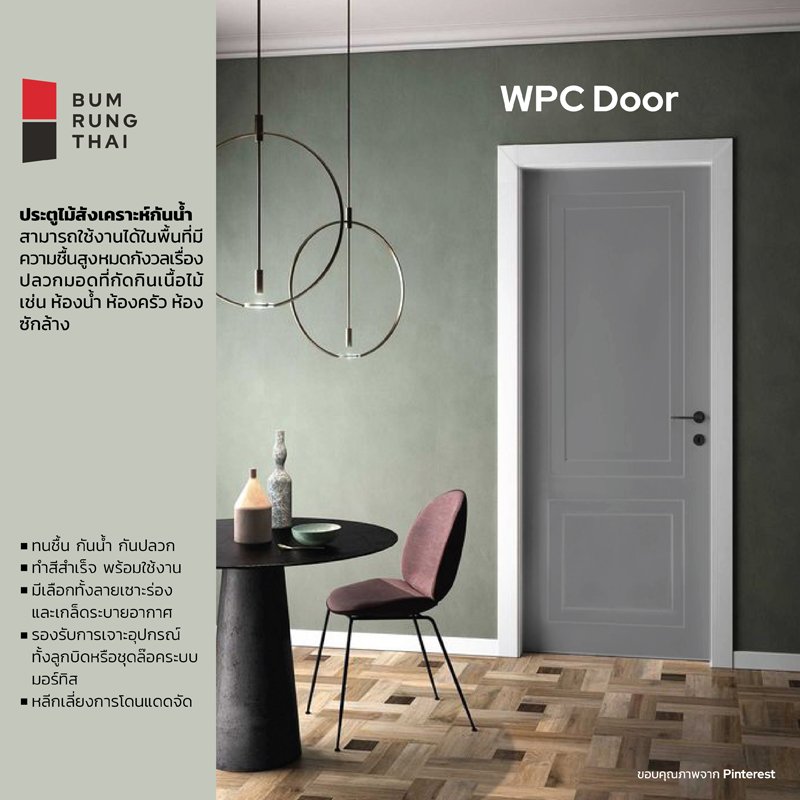 ประตูไม้สังเคราะห์กันน้ำ สามารถใช้งานได้ในพื้นที่มีความชื้นสูง หมดกังวลเรื่องปลวกมอดที่กัดกินเนื้อไม้ เช่น ห้องน้ำ ห้องครัว ห้องซักล้าง