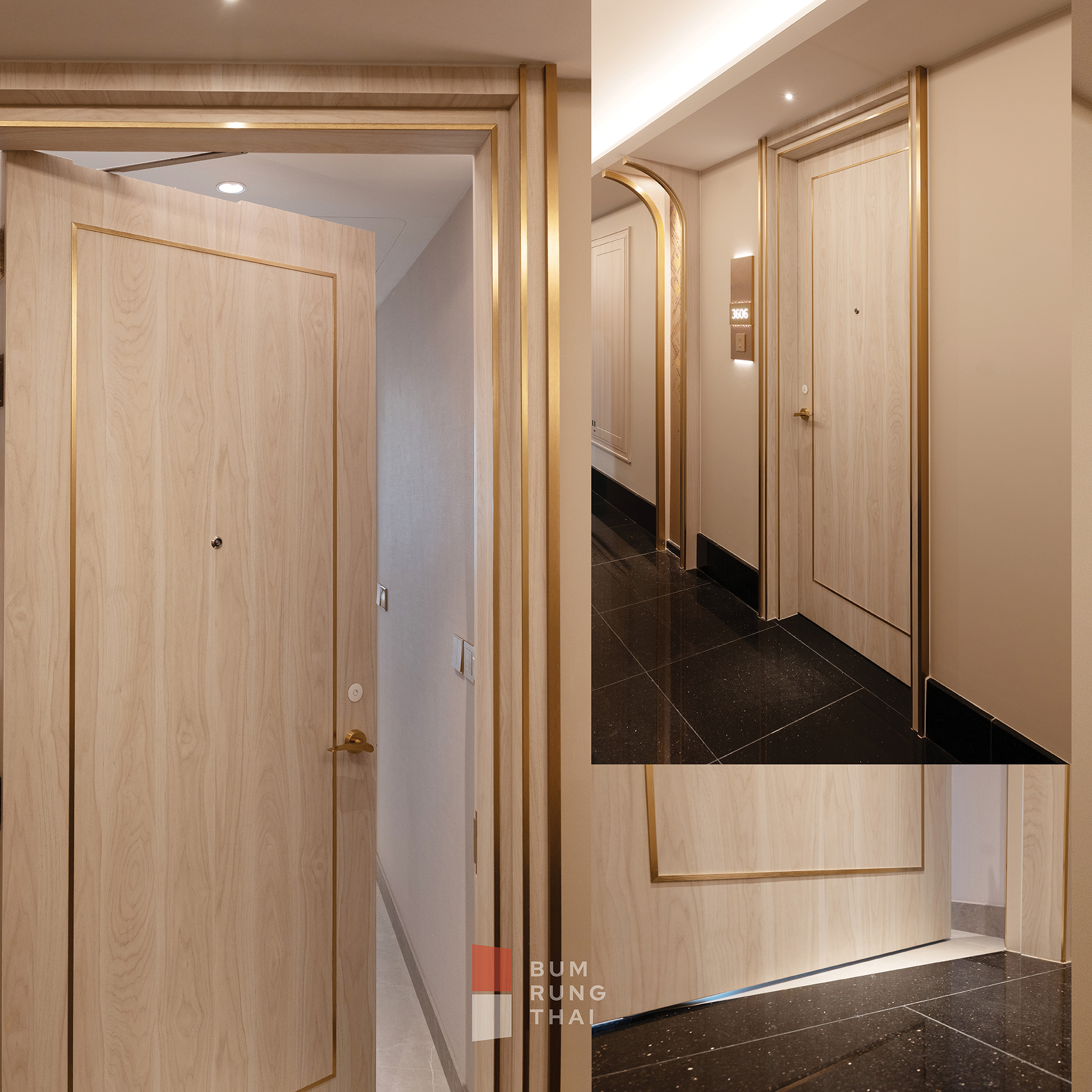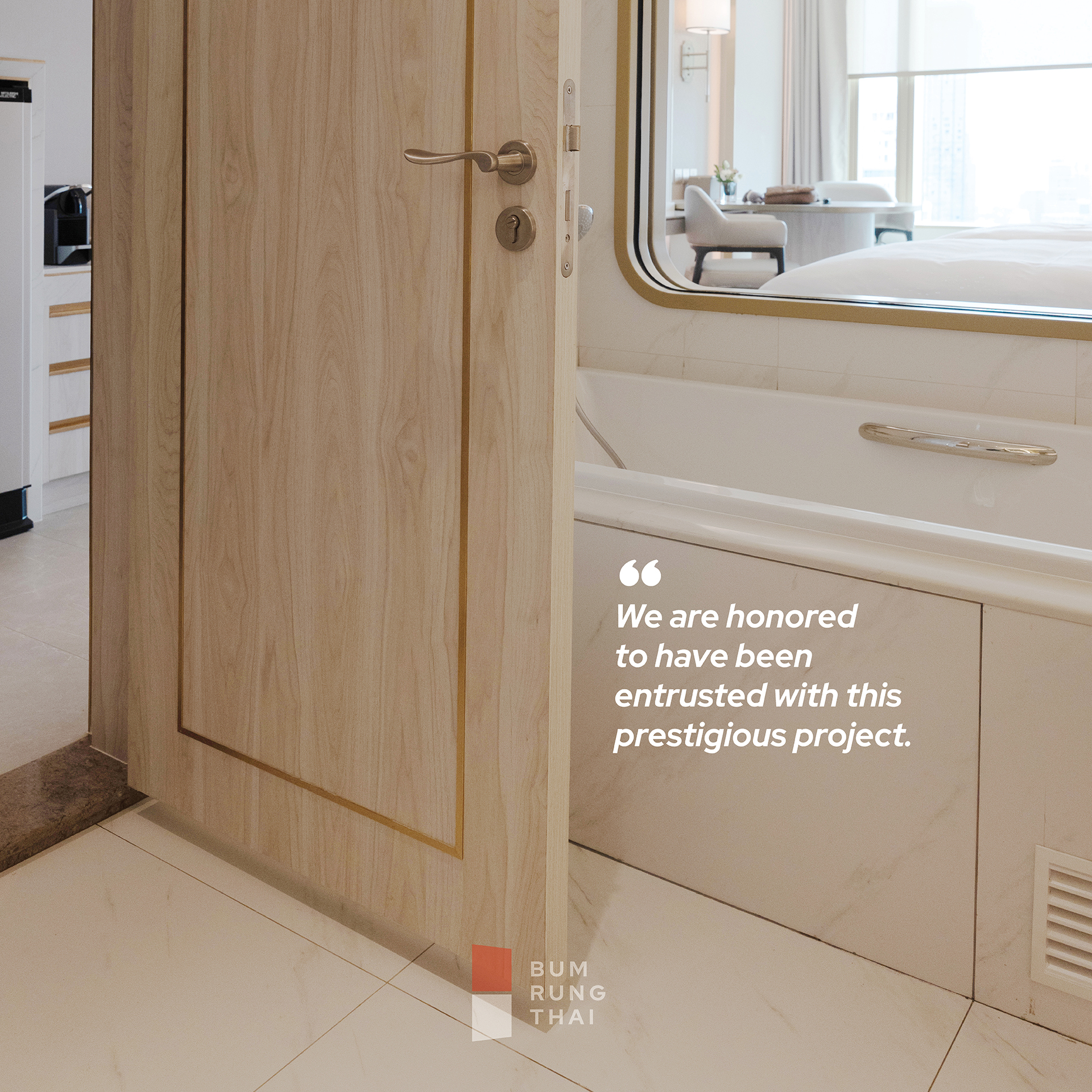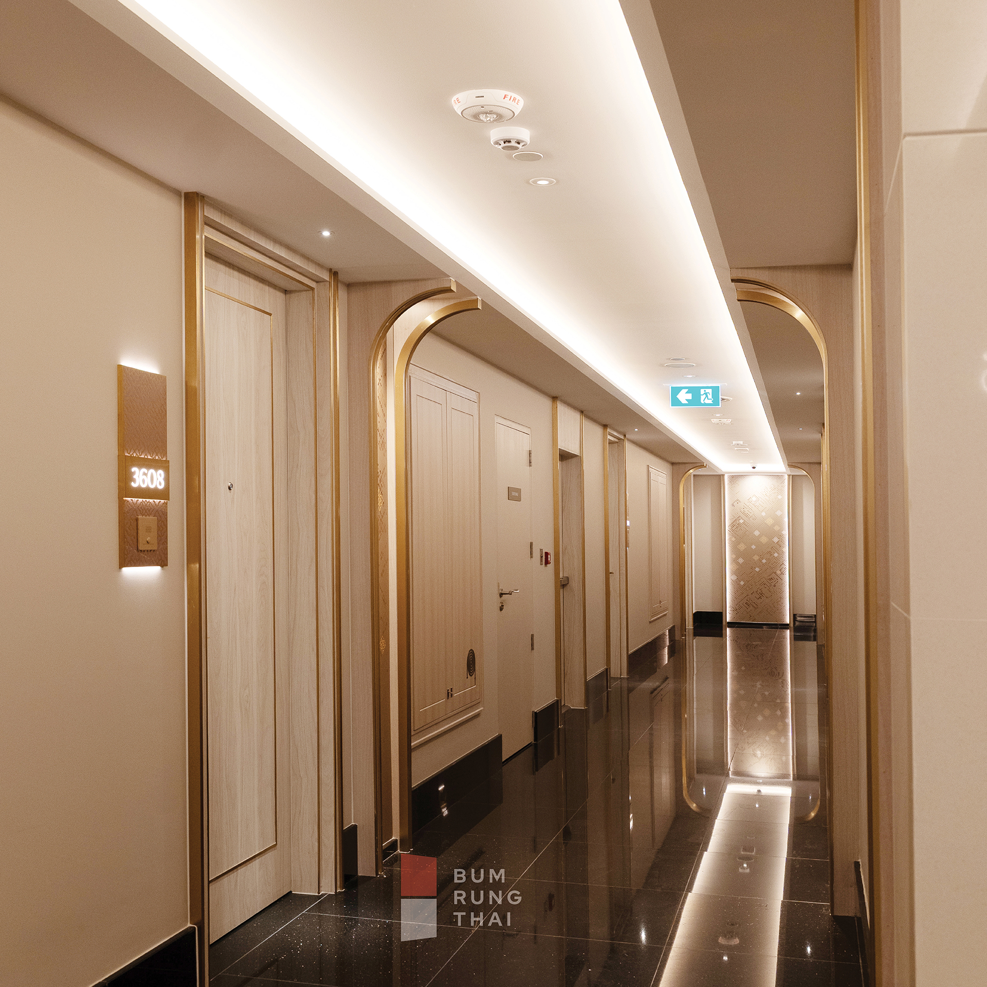 ประตูห้องพักบานหน้าและประตูห้องน้ำ จำนวนมากกว่า 500 ห้อง โดยเป็นประตูกันเสียง ปิดผิวด้วยแผ่นลามิเนต พร้อมตกแต่งด้วยโลหะอลูมิเนียมและชุดอุปกรณ์คุณภาพ ติดตั้งร่วมกับวงกบไม้จริงปิดผิวลามิเนต ตกแต่งด้วยเส้นโลหะอลูมิเนียมโทนสีเดียวกัน รวมถึงงานแผงตกแต่งบริเวณทางเดิน